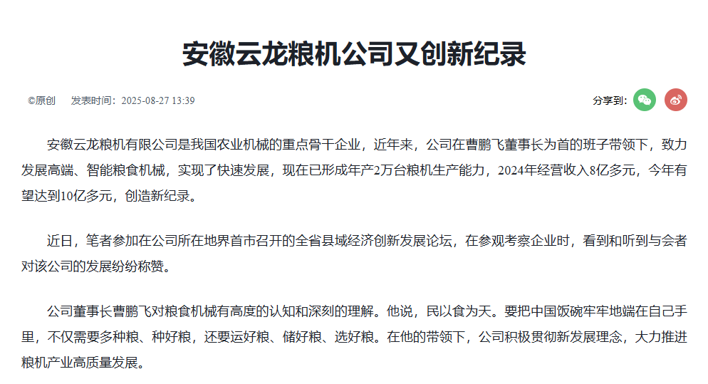 • 2025-08-29 中國工業(yè)新聞網(wǎng):安徽云龍糧機(jī)公司又創(chuàng)新紀(jì)錄